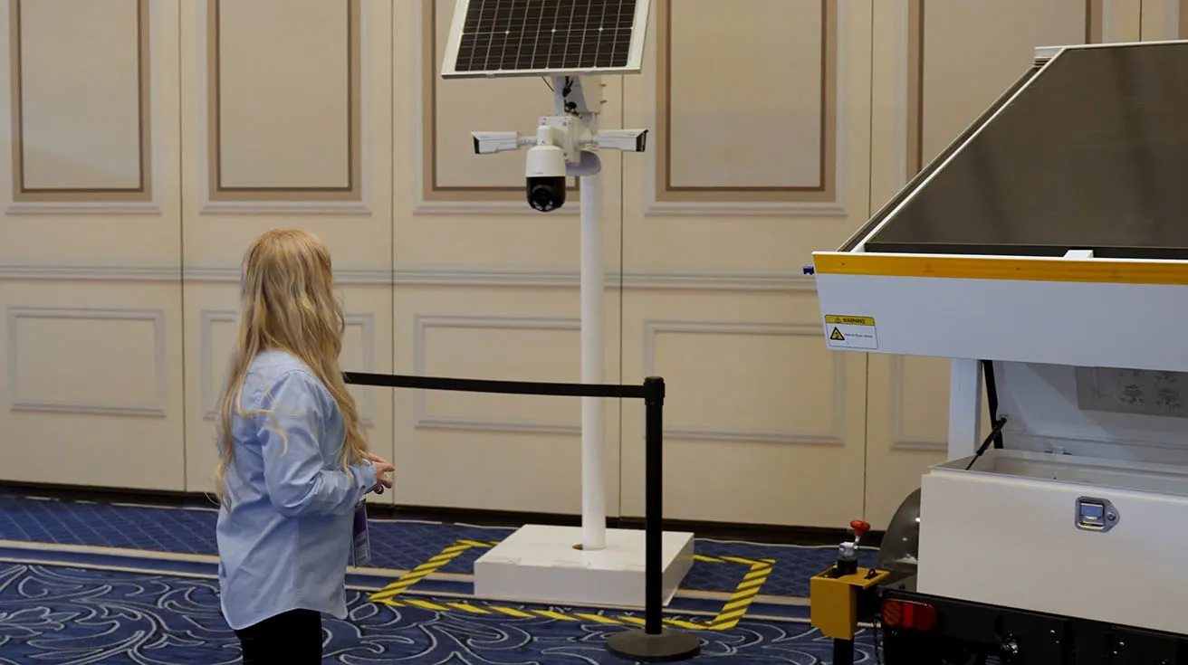 Right next to the trailer, we debut LumiWatch, our pole‑mounted off‑grid unit that brings the same idea down to a more compact form factor. Think of LumiWatch as the answer for sites where a full trailer is overkill, but you still need solar power and local intelligence at a pole, fence line, or perimeter corner.