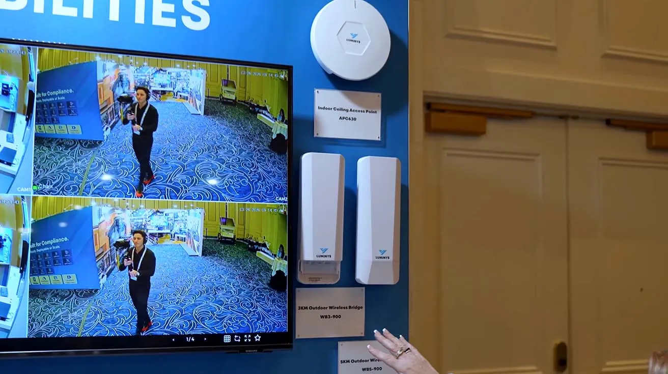 From there, we move into the network building blocks that keep these systems connected. At the booth, we debut a new indoor ceiling access point and a pair of wireless bridges that help you reach out to remote buildings, lots, and hard‑to‑cable corners of a site. For many deployments, this is what lets you bring Luminys security cameras and trailers online without running new fiber or trenching long copper runs.