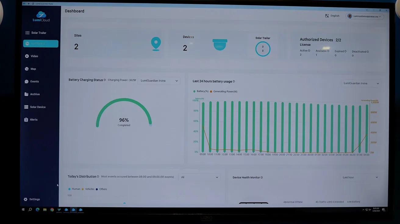 In the live LumiCloud demo, Greg pulls up a dashboard view for a LumiGuardian trailer, showing battery status, power generation, and connected cameras in one place. On the same page you see counts of detected humans and vehicles, and you can dive into specific video events filtered by attributes such as human, vehicle, and line crossing.