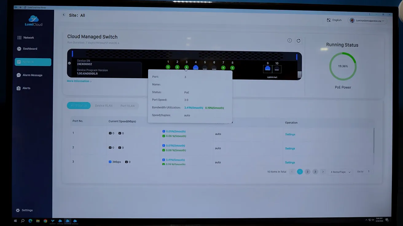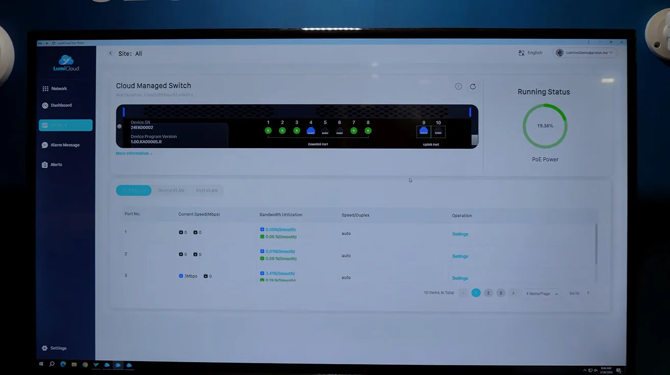 Greg then shows cloud‑managed network switches inside LumiCloud. From the platform, you can see a representation of each switch, check per‑port bandwidth and PoE status, and remotely turn ports on or off during maintenance. For security integrators managing multi‑site deployments, this is a practical way to support cloud-managed PoE switches for CCTV without separate tooling.
