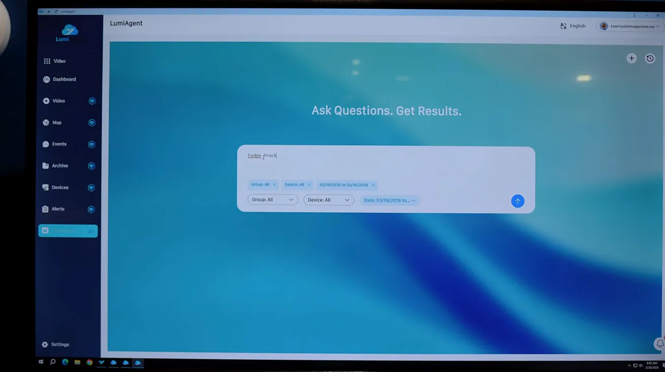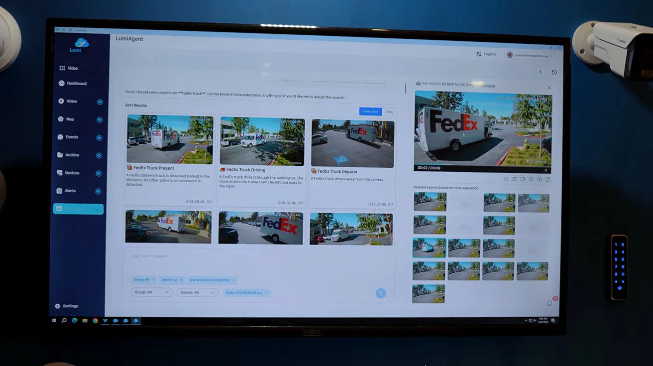 Finally we introduce LumiAgent, our new AI assistant for video search inside LumiCloud. Greg types in “FedEx truck” and LumiAgent returns a list of relevant video events with short AI‑generated summaries, all found by interpreting the natural language query and matching it to recorded footage. From there, you can play clips, go full screen, or share them, just like any other LumiCloud event.