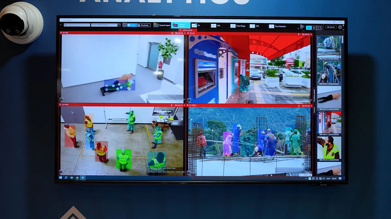 Back at the LumiCenter VMS station, we show how these ideas extend to on‑prem environments. On screen, we demonstrate fall detection, PPE detection for safety vests and hard hats, and behavior analytics flagging suspicious ATM activity, all running as LumiCenter analytics.