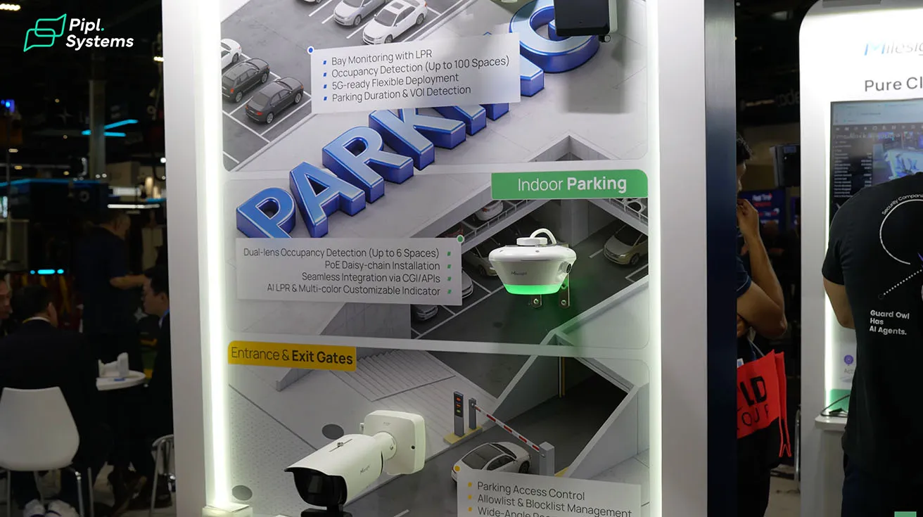 Moving further into the booth, we are displaying our comprehensive intelligent parking solutions. We provide hardware for outdoor lots, indoor garages, and entrance/exit gate access control.