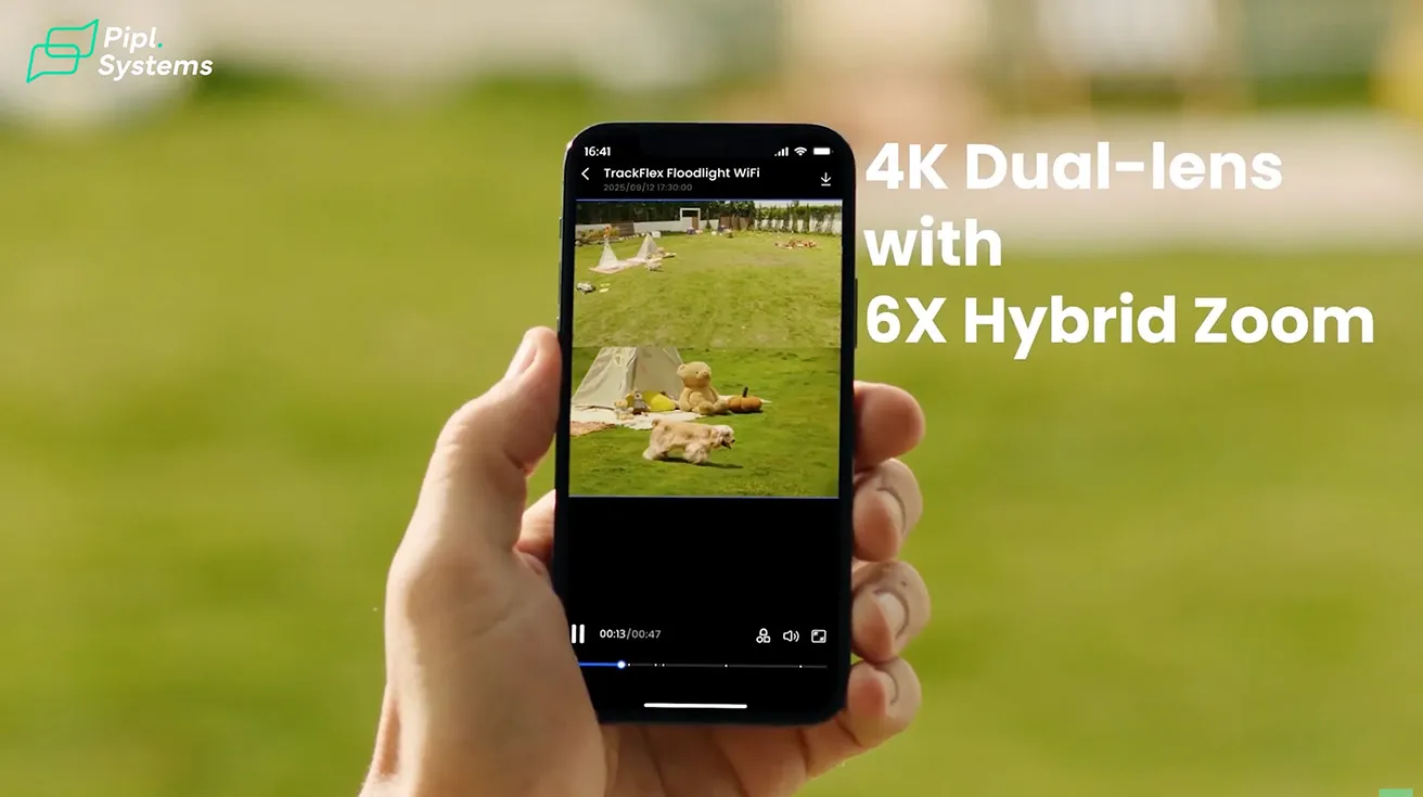 After using the camera for a bit, it is worth talking about what is actually inside this system. The TrackFlex Floodlight WiFi is a hardwired dual-lens 4K floodlight camera with PTZ movement. It combines an 8 MP wide-angle lens with a telephoto lens that supports 6x hybrid zoom. This means the camera can keep a full view of the area while also zooming into detected movement. A motorized base provides up to 355° pan and 50° tilt, allowing the camera to cover wide areas with no blind spots.