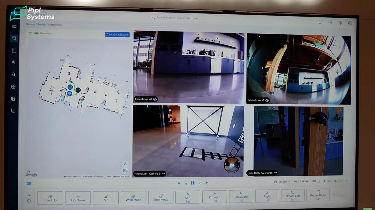 Let me show you exactly how Rhombus Recon works in practice. The robotic device is equipped with two primary cameras. Through our console, you maintain full control and can see exactly what the robot sees. A map on the left side of your dashboard tracks the unit in real time. You can manually command the dog to stand up, sit, lay down, or walk around. You can move it forward or backward to investigate a specific area. The entire time, it captures and streams high-quality footage directly into our cloud platform.