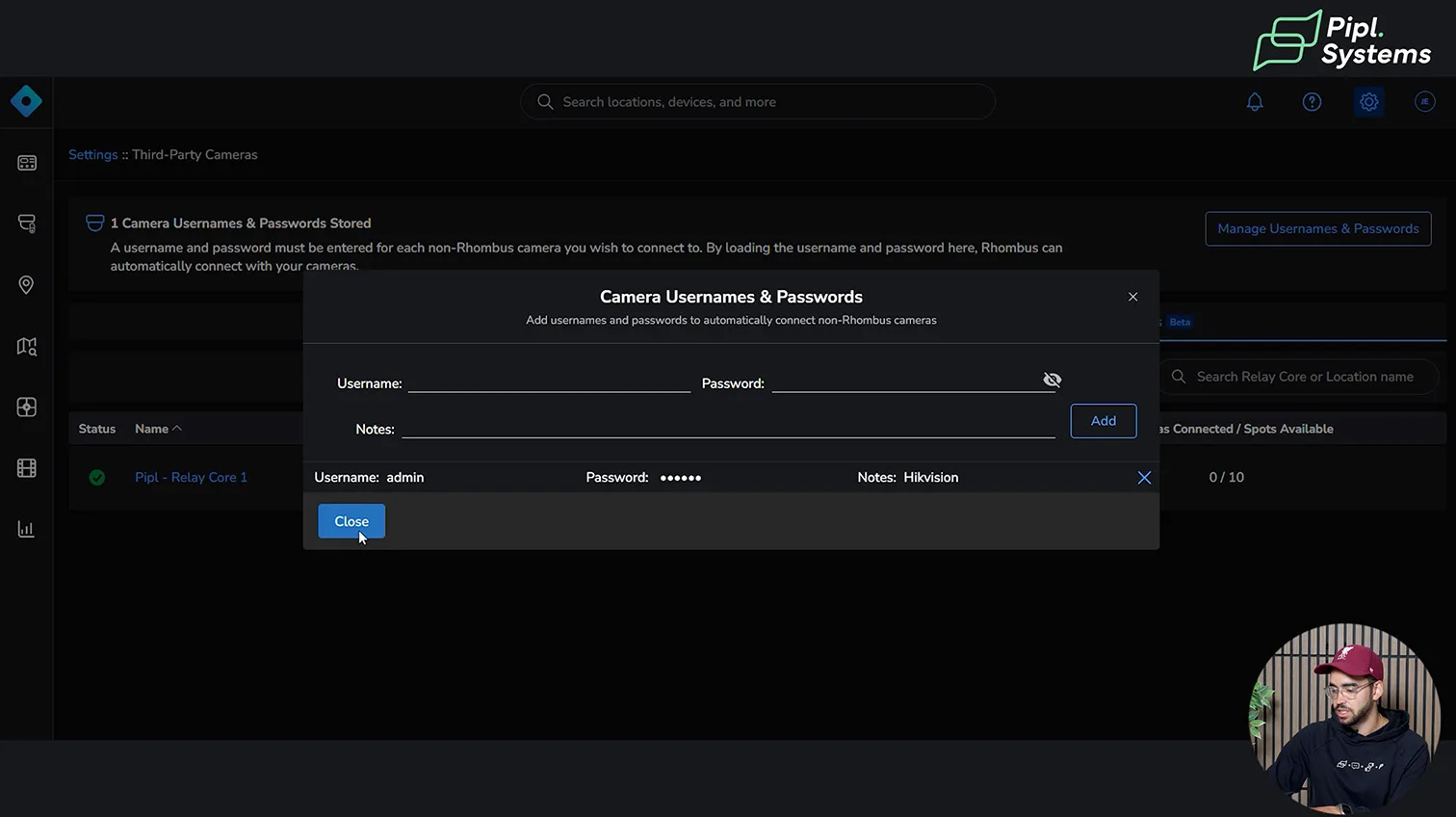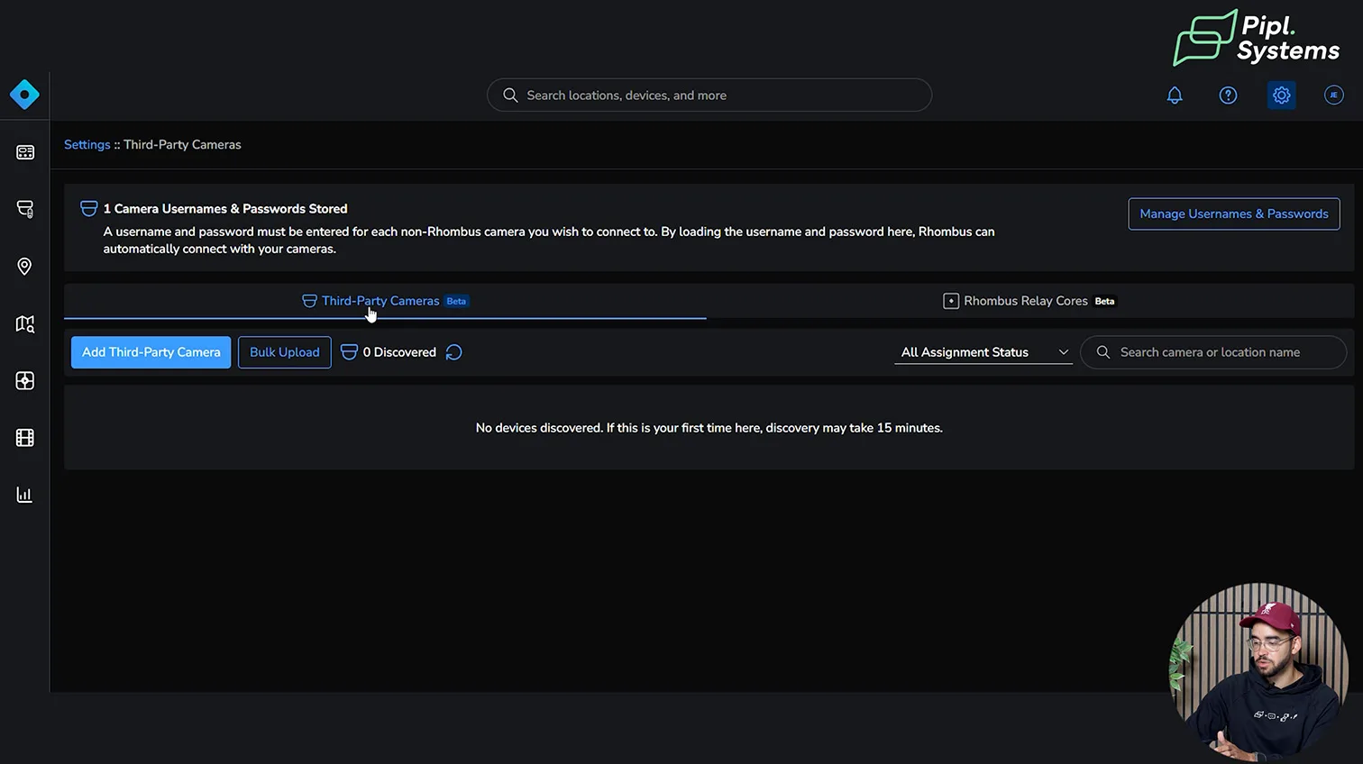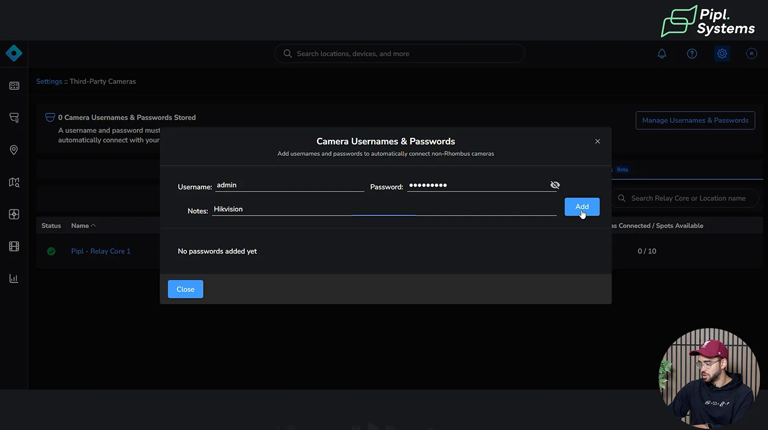 Before adding a camera, go to Manage Usernames & Passwords in the top right corner of the Third-Party Cameras panel. Here, you can store credentials for each manufacturer or camera model, making it easier to apply them across multiple units from the same vendor. This is particularly useful if you’re managing legacy hardware, such as a batch of Hikvision cameras installed years ago.