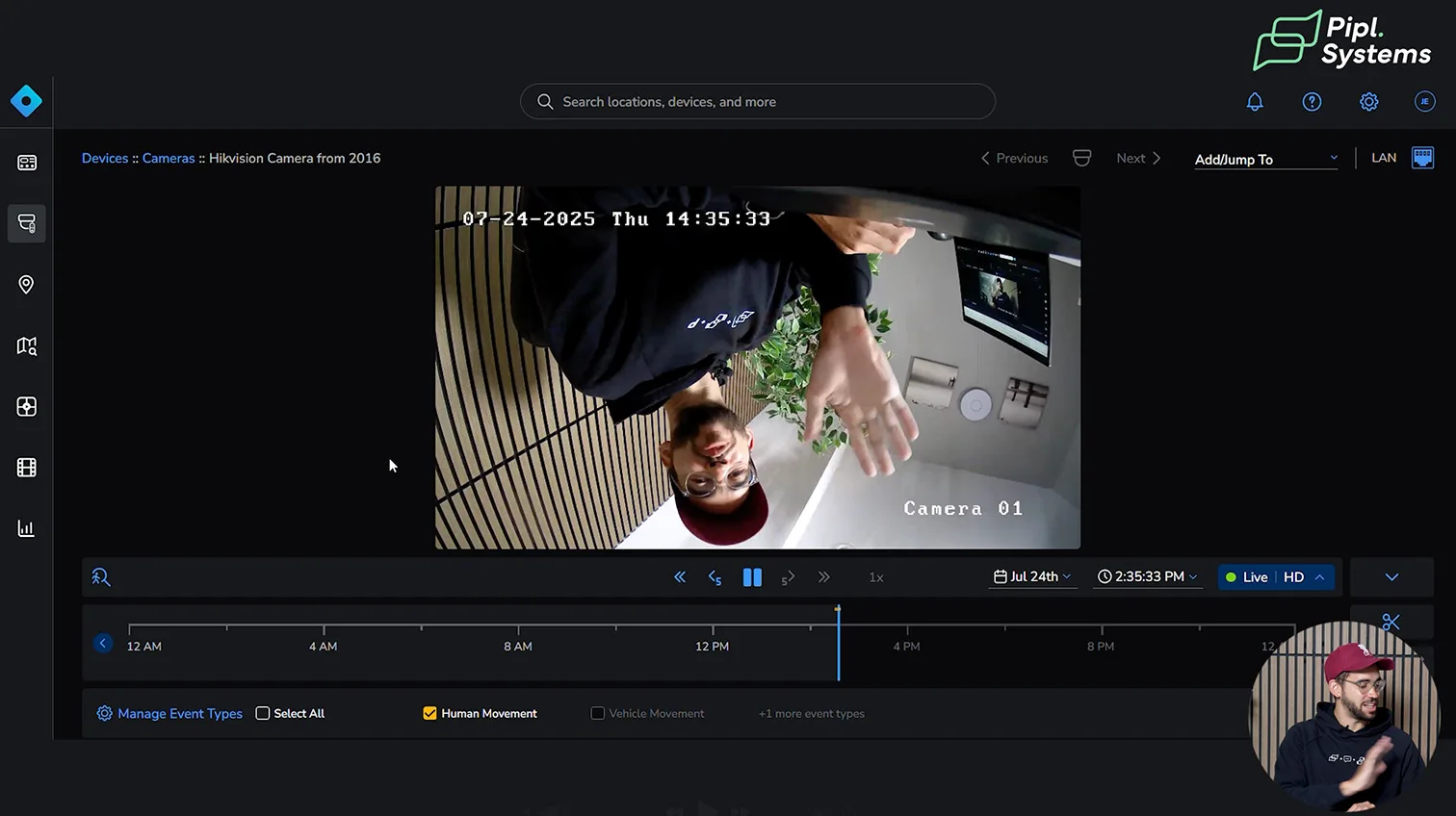 If the stream is accessible, the Rhombus Console will display the camera as active. You’ll then be able to open its Live View, browse recorded footage, and tag motion events like human or vehicle activity – all from the same interface.
