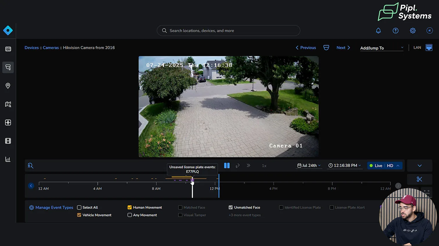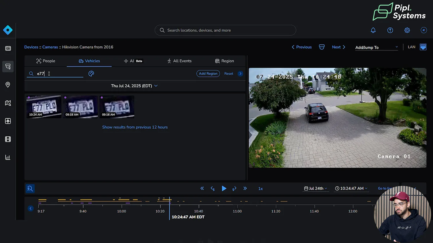 Despite the inherent limitations of a 2MP resolution, the system consistently recognized plates. Typing the first few letters of a plate surfaces matches across multiple video clips, and Rhombus automatically highlights plate events with a purple badge for easy timeline navigation.
