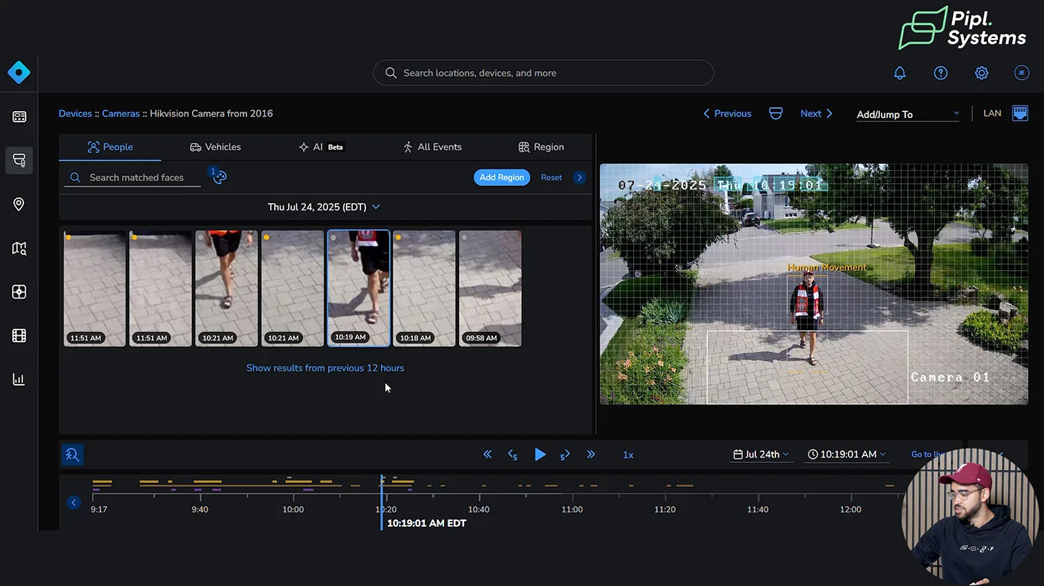 After initial AI detections are made, Rhombus Console enables a deeper dive into the footage through a streamlined, event-based interface. Users can navigate between different AI-classified events – such as license plate recognition, human detection, and unmatched faces – using easily recognizable icons. The timeline remains color-coded and interactive, allowing for rapid zoom-in and direct access to clips tied to specific detections.