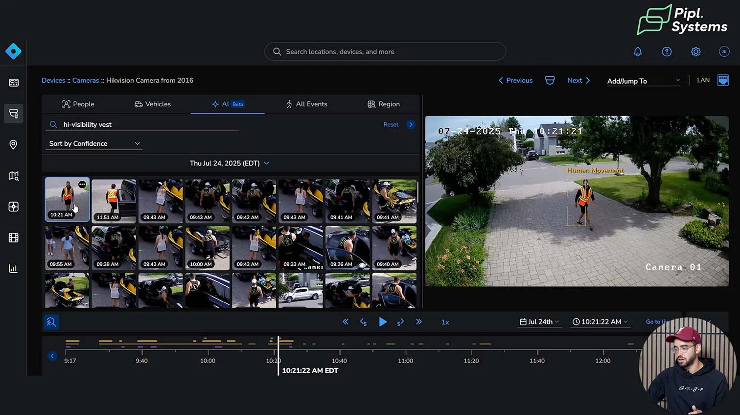 One of the most compelling features in the Enterprise license is AI Prompt Search. Users can type a natural-language prompt, such as “man with purple hat” or “high visibility vest,” and receive ranked video events sorted by confidence level.