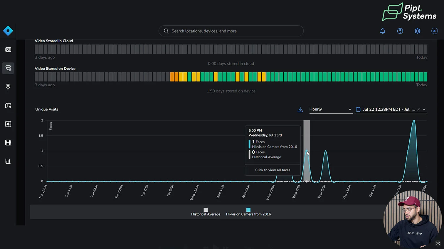 Even when using an aging 2MP ONVIF camera, the system accurately tracked human visits and face appearances across multiple days – a function normally reserved for high-end modern analytics systems.