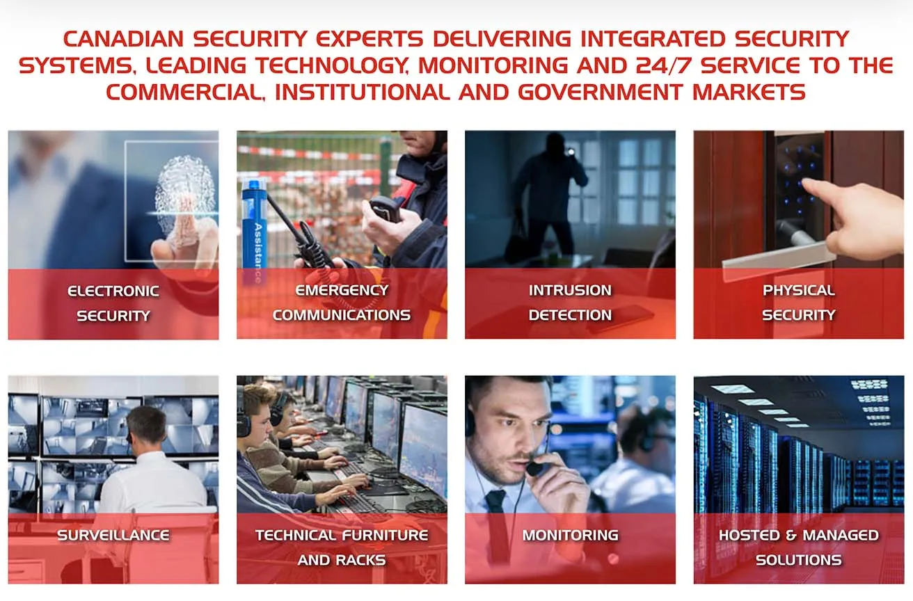 – 24/7 system monitoring and management – Regulatory compliance solutions – Hosted security services. The company specializes in high-end security integration for government institutions, transit systems, and large commercial clients.