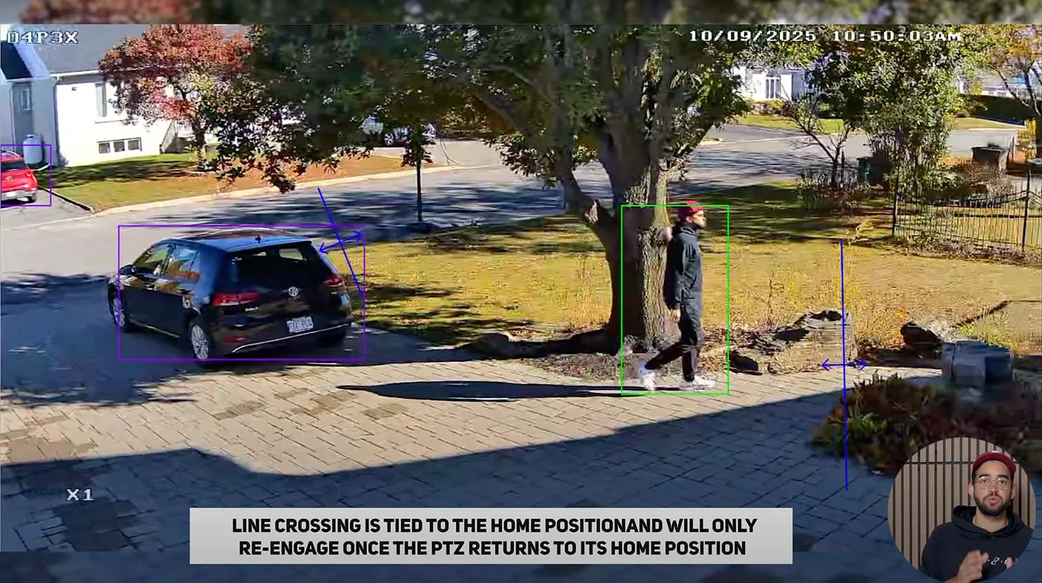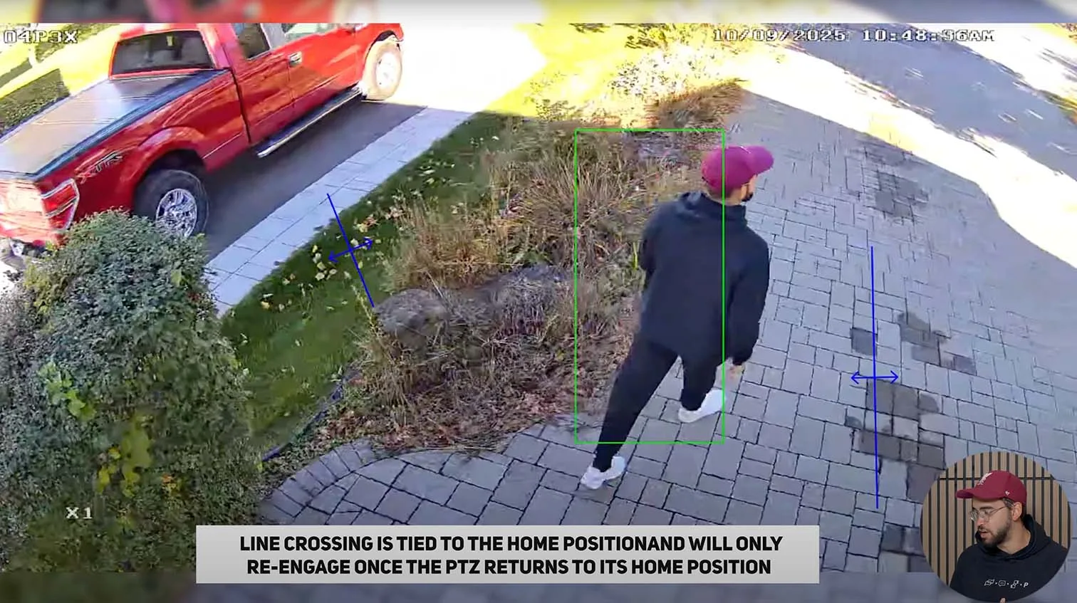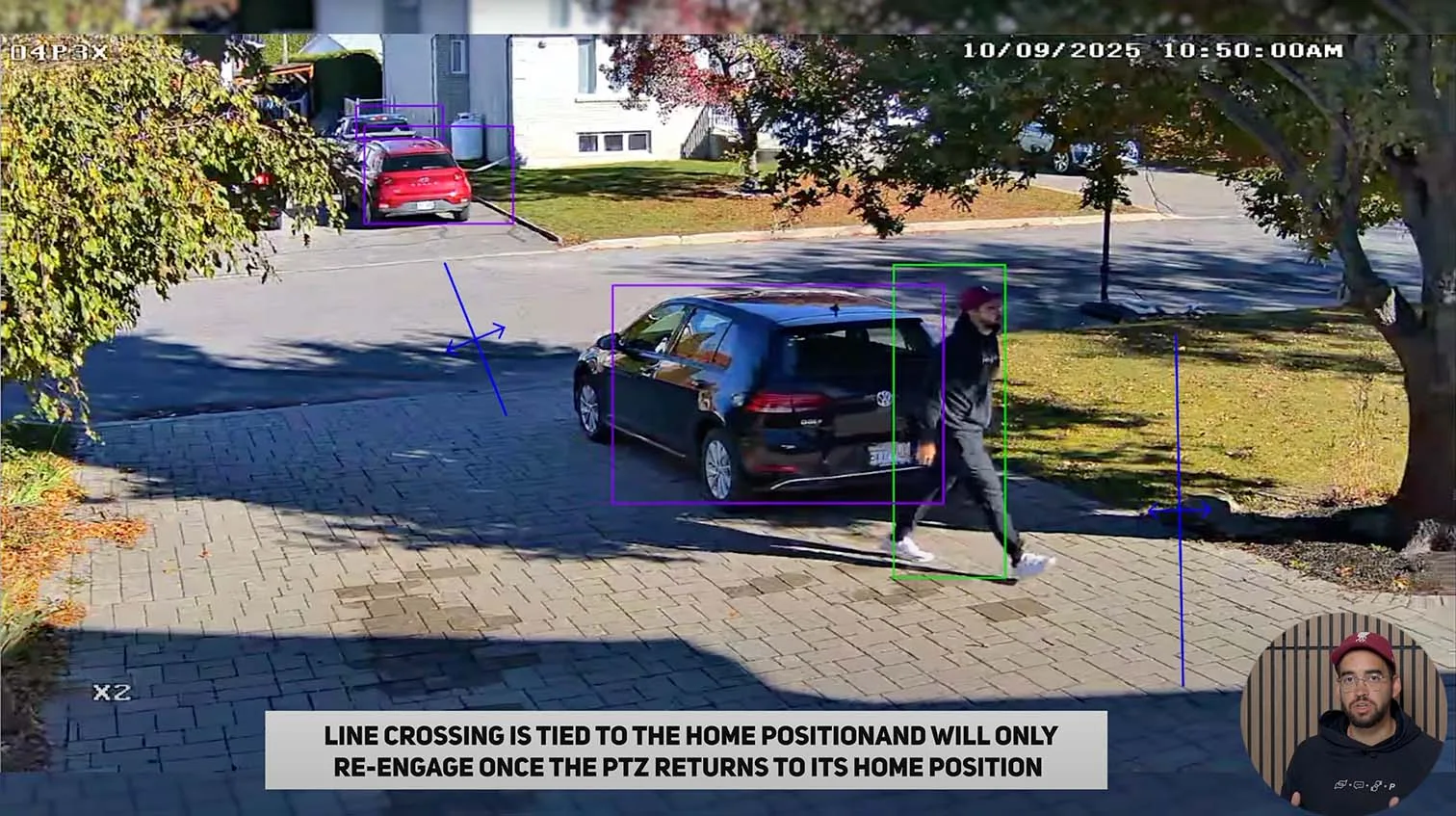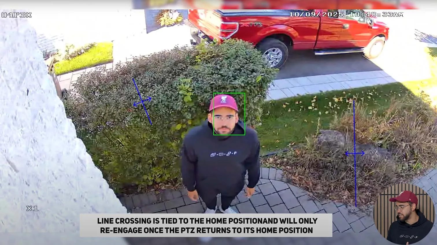 The O4P3X leverages advanced analytics to actively follow both people and vehicles within its field of view. As soon as a subject enters a monitored area, such as approaching a building entrance or moving through a parking lot, the camera automatically identifies and locks onto the subject. We configured multiple virtual line crossing zones in our studio: every time a person crossed into a secure area or a vehicle entered the driveway zone, the tracking was triggered. The camera panned and zoomed smoothly, keeping the moving subject in frame with minimal delay or jitter.