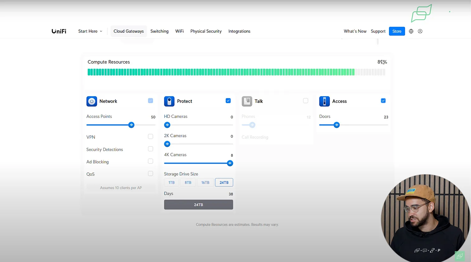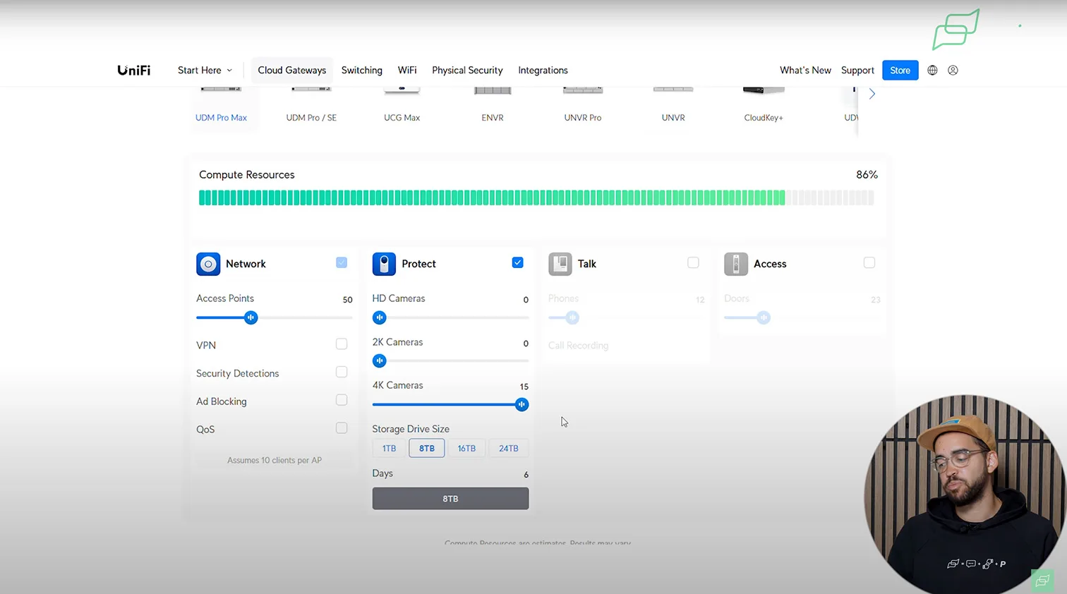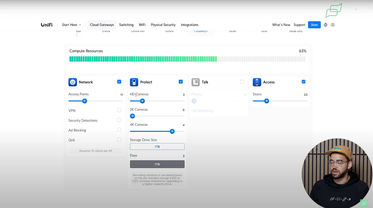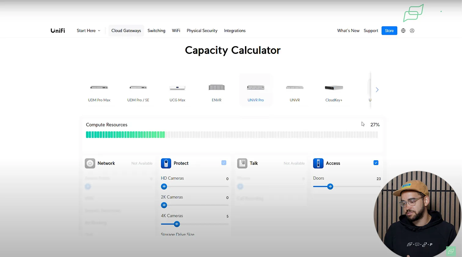 We recommend starting with Ubiquiti’s official capacity calculator – this tool shows only compatible devices and gives insight into system limits, such as camera counts, AI load, and video retention. It’s not just about what works now, but what will work as your needs grow.