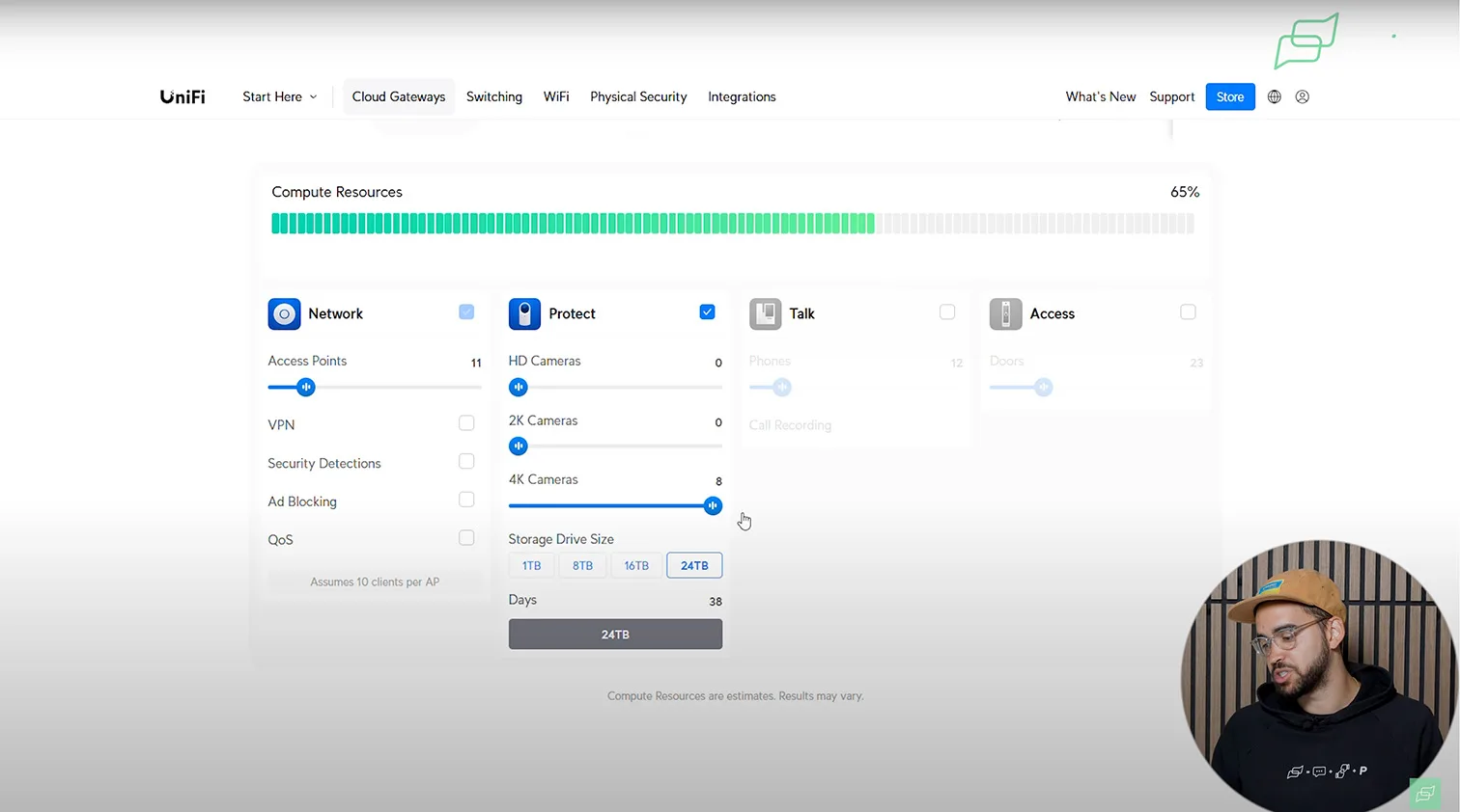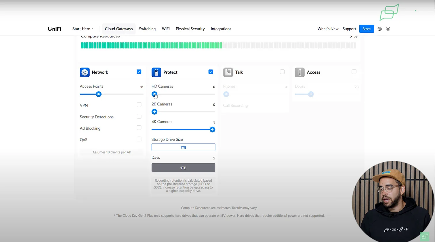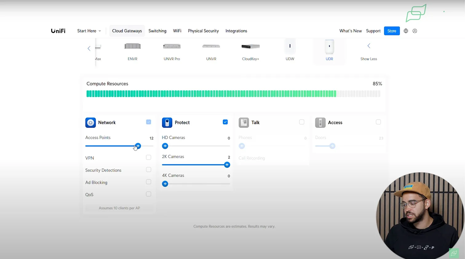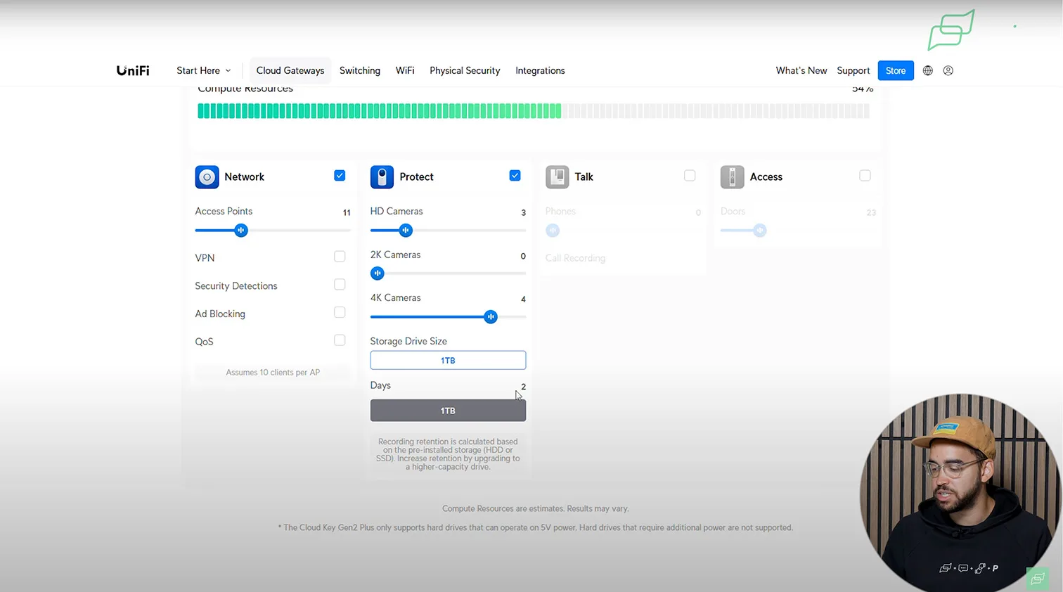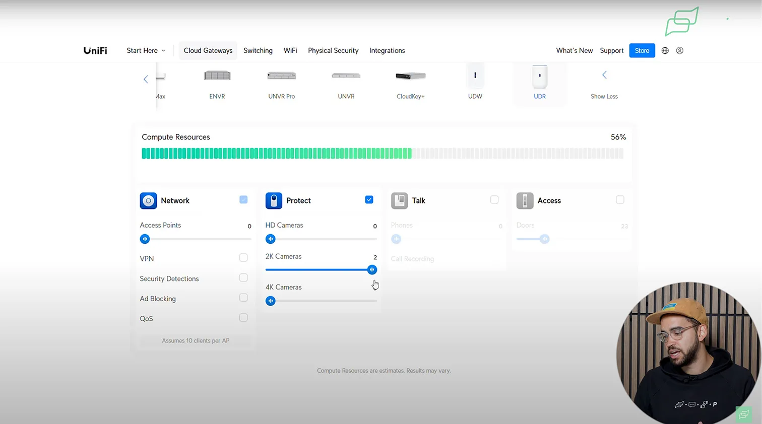 We recommend starting with Ubiquiti’s official capacity calculator – this tool shows only compatible devices and gives insight into system limits, such as camera counts, AI load, and video retention. It’s not just about what works now, but what will work as your needs grow.