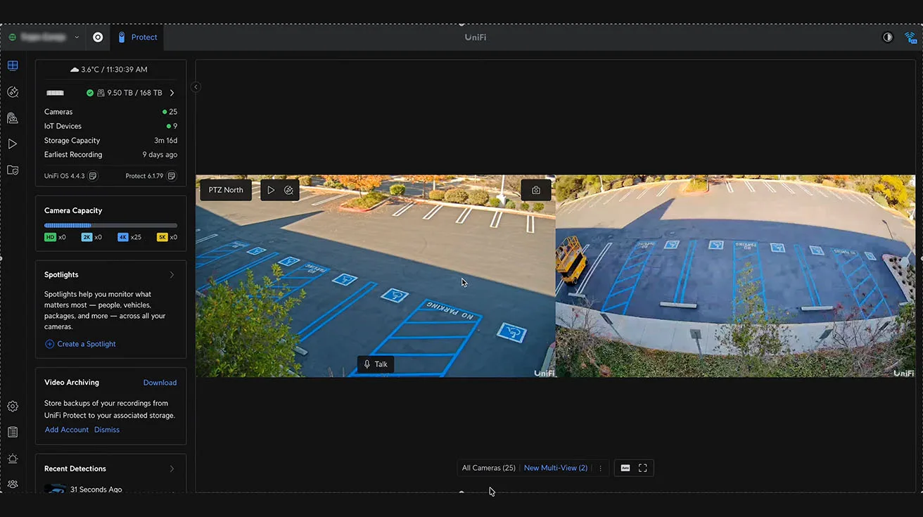 - UniFi AI PTZ Precision Cameras: Paired with the G6 Pro, the AI PTZ Precision is installed on each corner. While the G6 Pro acts as a stationary eye, the AI PTZ Precision operates in a patrolling mode, constantly scanning its assigned area. What makes this combination truly powerful is their communication: if a G6 Pro detects an object or person, it triggers the AI PTZ to automatically zoom in and track the subject, providing detailed video of any event. This intelligent auto-tracking feature significantly enhances situational awareness. You can dive deeper into the advanced features and setup of the UniFi AI PTZ Precision in this article: Ubiquiti UniFi Protect UVC AI PTZ Precision.